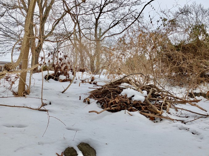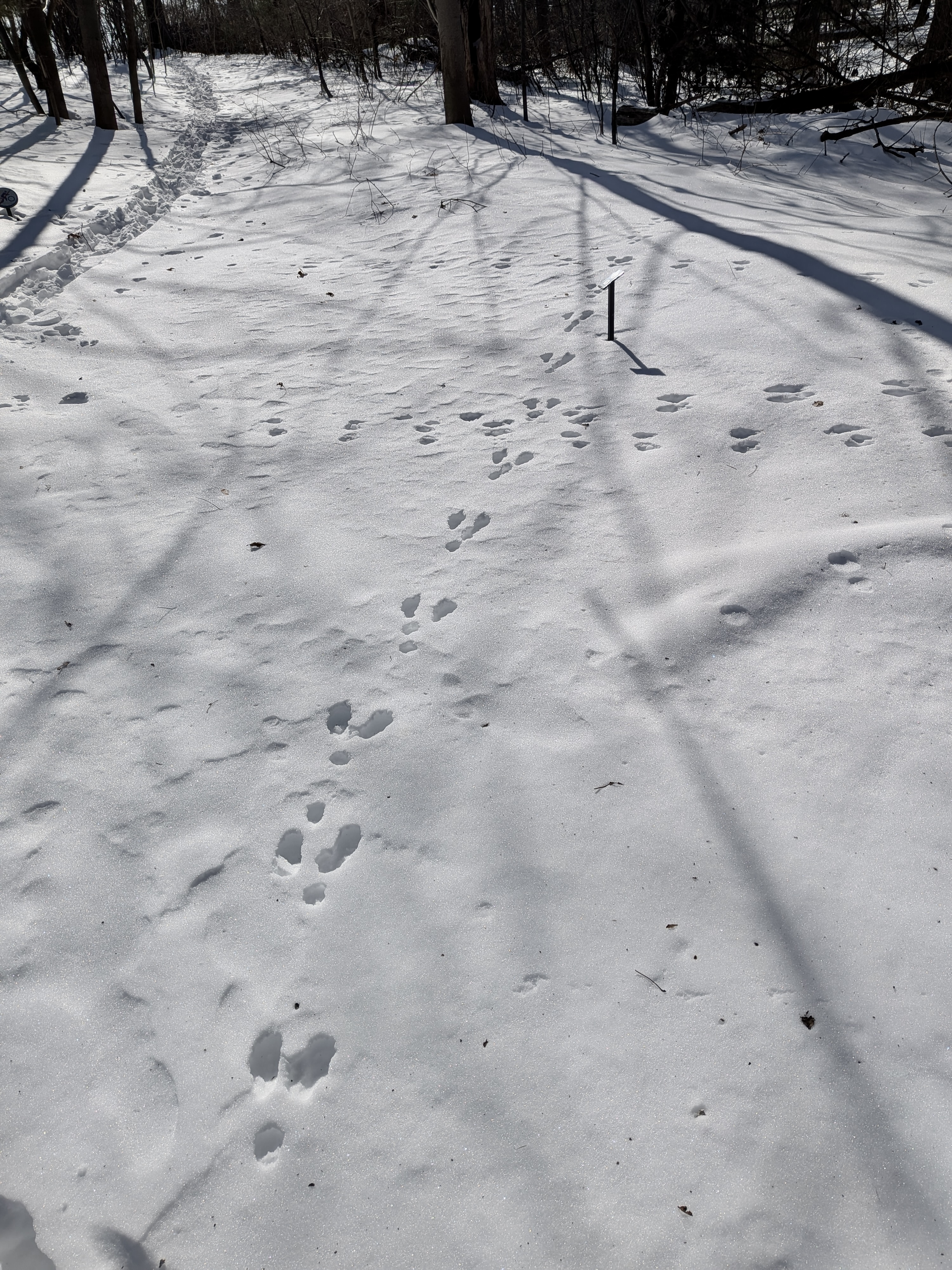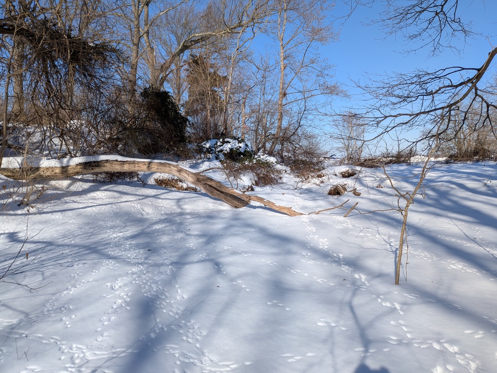Before the snows came, Nature Trail volunteers constructed a number of brush piles using debris from the wind storm of July 3rd, 2025. The thick snow cover provided an opportunity to “track” visitation rate and structural effectiveness of these new wildlife shelters.Â