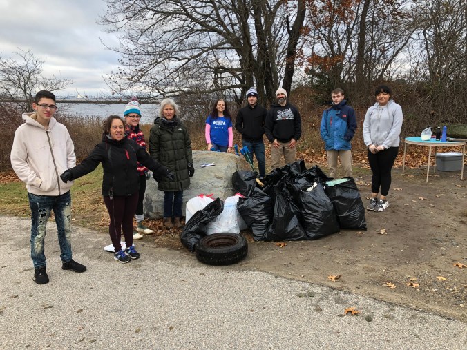 Those who stayed to the chill end of the cleanup on November 25. Two of the three co-leaders (besides Trent Batson who took the photo) are in the picture: 3rd from left is Casey Gonsalves and 4th from left is Mary Newton.