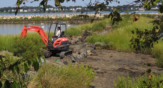 Narragansett Dock Works staged equipment and materials for repair and surfacing of the causeway at Salter Grove that leads out to the breakwater on Wednesday, August 14th. Vehicles should not enter this section of the roadway.