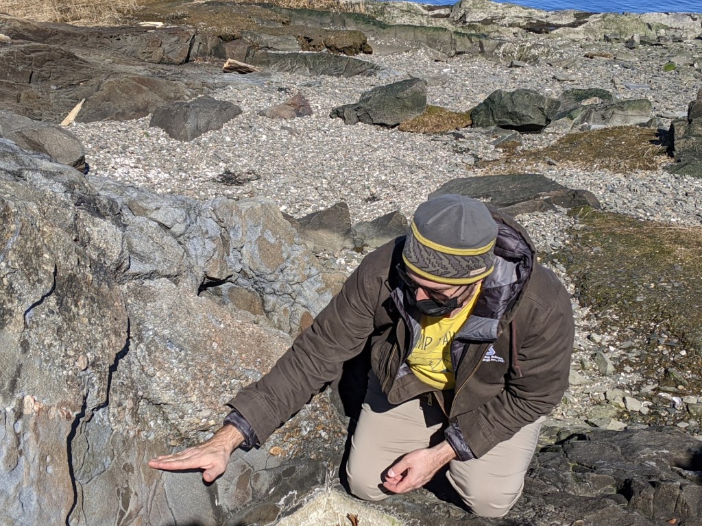 Jonathan explains how conglomerates, sometimes referred to as puddingstone, are metamorphosed sedimentary rocks. These are part of the Rhode Island Formation and are Pennsylvanian in age (298-323 million years old). These conglomerates formed in a turbulent environment similar to a river bottom where the rounded cobbles and sandy matrix eventually were compressed through burial. During the Pennsylvanian Period, Rocky Mountain-sized ranges occurred east and west of the present Narragansett Bay, and their erosion produced enormous quantities of sediment that filled the space between, including wide river basins similar to the San Joaquin or Sonoma Valleys.During the Pennsylvanian Period, which was the later portion of the Carboniferous, our park was adjacent to a swamp forest of horsetail (Equisetum) ancestors with bamboo-like trunks up to 40 ft tall. Jonathan is pointing to the fossilized remains of a stem of one of these Calamites. This fossil of a preserved plant from over 300 million years ago has stood the test of time, glaciers and sea level rise to showcase the park’s unique position in regional paleontology. These trunks lay in metamorphosed grey sand with beds of gravel. This type of environment could be found in modern day rivers similar to the Mississippi delta.We’ve all seen how storms can tear up a coastline or re-channel a river. That’s what happened here, but over 300 million years ago. Above Jonathan’s hand is a band that was deposited by fast-flowing water with enough energy to carry rounded pebbles. The layer below was deposited by slower moving water that could only carry smaller sediment. This unit of rock is likely upside down, a result of two continents that collided with North America between 300 million years ago and today. Notice how unique a situation exists in our park whereby the rounded clasts in a 300 million year old conglomerate are preserved alongside an active beachfront where the same rounded pebbles are being weathered and will eventually be buried in the perpetual rock cycle.