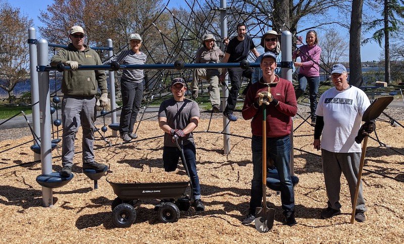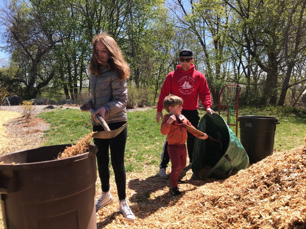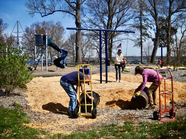 A thick layer of Rec Mix (thrice-ground wood fiber) purchased from Thompson Native Lumber was applied to the playground on Saturday, April 30th to restore safe play conditions.