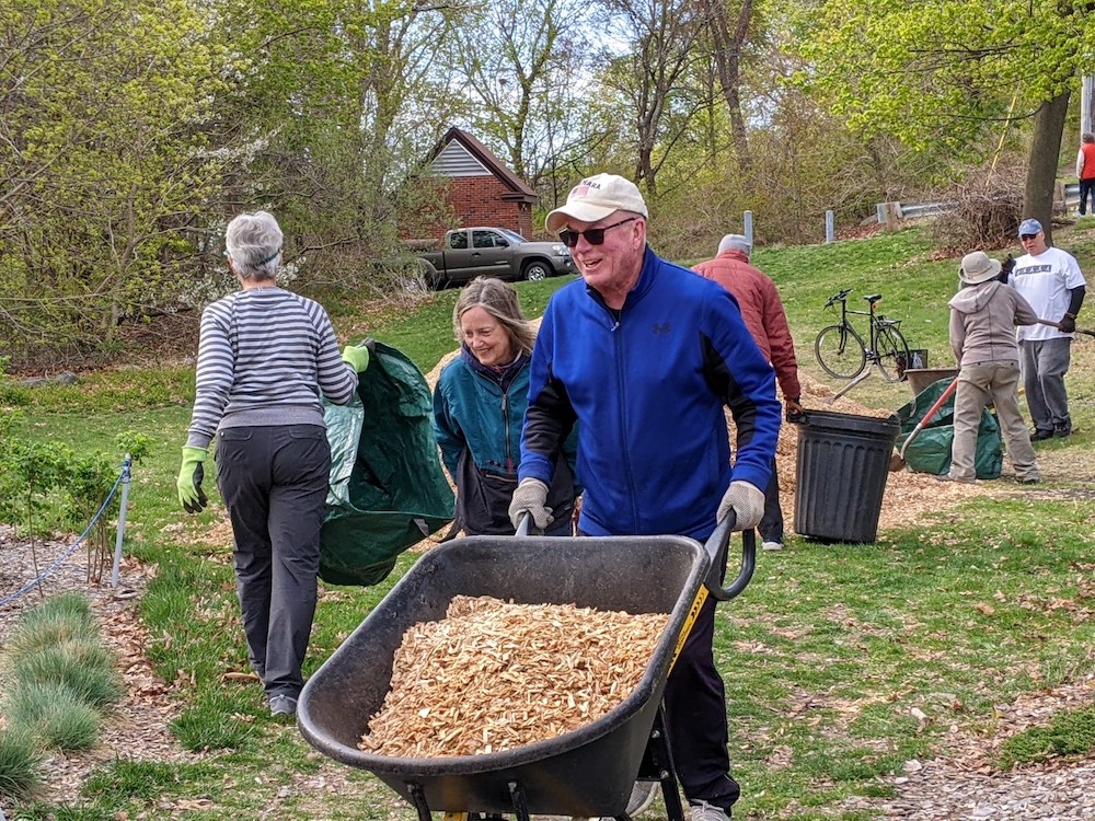 A hard-working group of FoSG members and volunteers spread 40 cubic yards of fiber in three hours.