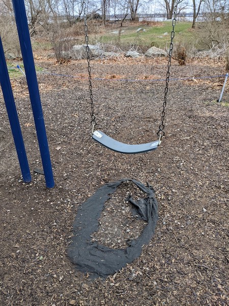 When the playground was first constructed in 2019, too little wood fiber, especially in the swing area, and exuberant use led to exposure of the underlying geotextile and gravel.