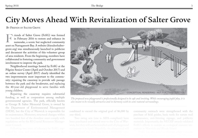 The ongoing efforts of the Friends of Salter Grove have been featured in the Spring 2016 issue of The Bridge, the newspaper of the Pawtuxet Village Association. Written by FOSG member Mary Grady, the article discusses our main goals to repair the causeway and shoreline access as well as acquire funding to improve the playground equipment and enhance the property throughout the park. The article can be viewed above, and you can read the entire Spring 2016 issue here or by picking a copy up at one of the many businesses around Pawtuxet Village.